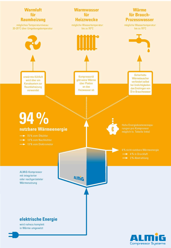 Kompressoren produzieren bei der Drucklufterzeugung Energie. Diese ungenutzte Energie kann dank der Wärmenutzung nahezu komplett in Wärme umgesetzt werden. Dadurch ergibt sich ein hohes Energiesparpotenzial. Eine Druckluftstation mit einem Leistungsbedarf von 75 kW bei 4.000 Betriebsstunden würde jährlich ca. 300.000 kWh Strom ersparen.