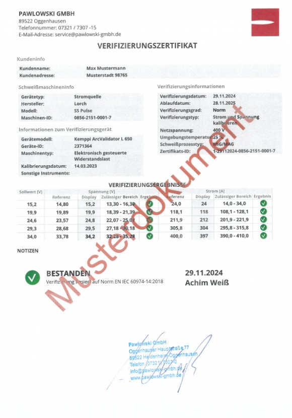 Mittels einer Verifizierung wird festgestellt, ob die Einstellwerte der Schweißanlage innerhalb der in der Norm festgelegten Bandbreite liegen. Die Norm DIN EN IEC 60974-14 legt die hierfür notwendigen Prüfschritte und Toleranzen fest. Strom, Spannung und Drahtvorschub haben Einfluss auf das Schweißergebnis, d.h. das Schweißgerät ist Glied der „Qualitätskette“.